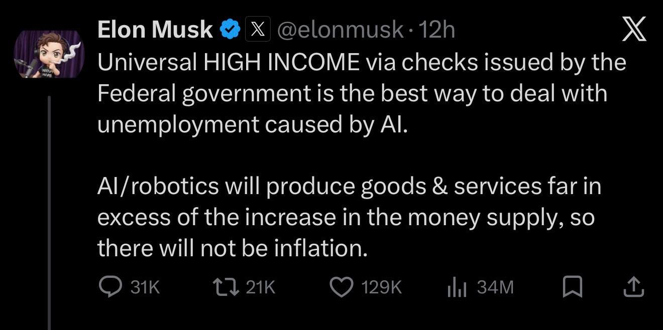 Ранее я писал, что стареющему обществу в эпоху AI-автоматизации предстоит трансформация фискальной модели, и оставил вопрос открытым. Илон Маск любезно закрыл его за меня.